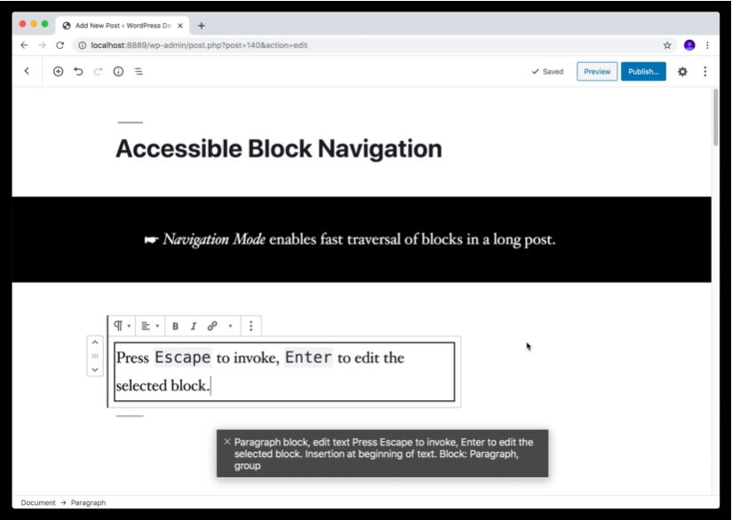对于使用键盘导航仪表板的用户,块编辑器现在具有“导航”模式。这使用户可以从一个块跳到另一个块,而无需浏览块控件的每个部分。